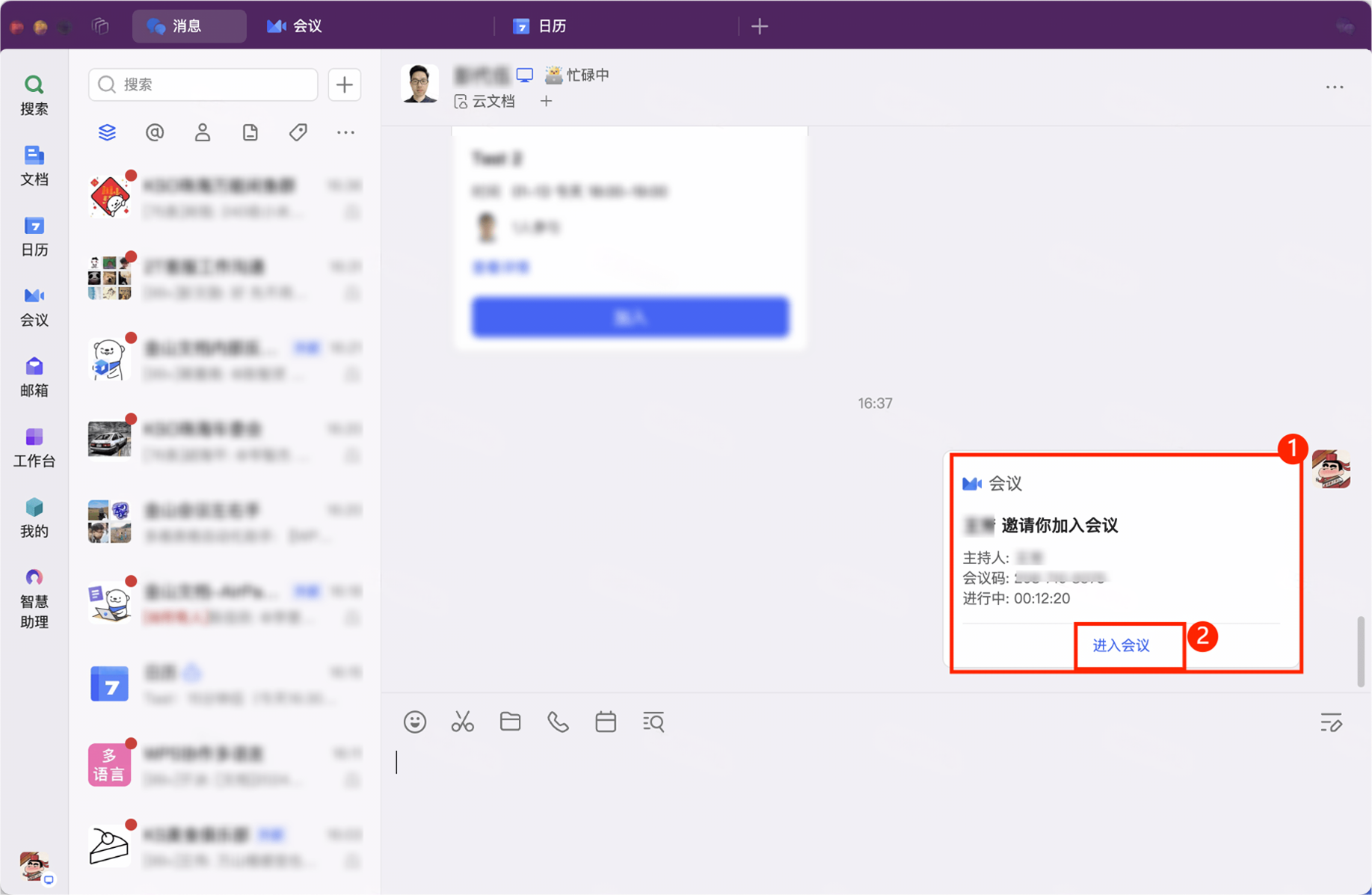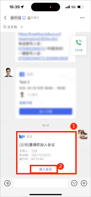 对于分享至【聊天】中的会议,可直接点击【会议卡片】入会,方便快捷。