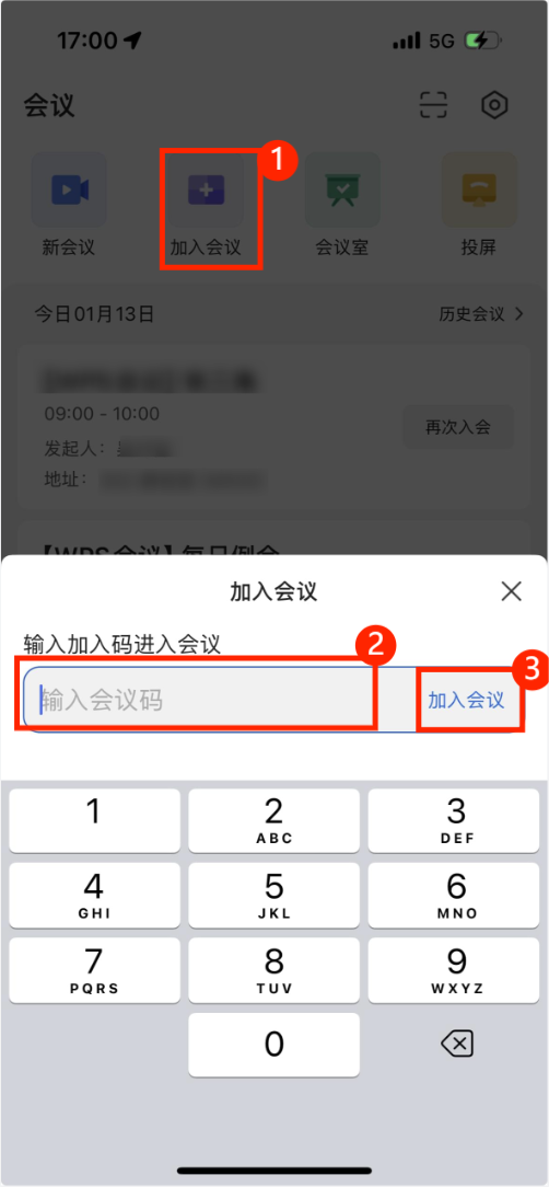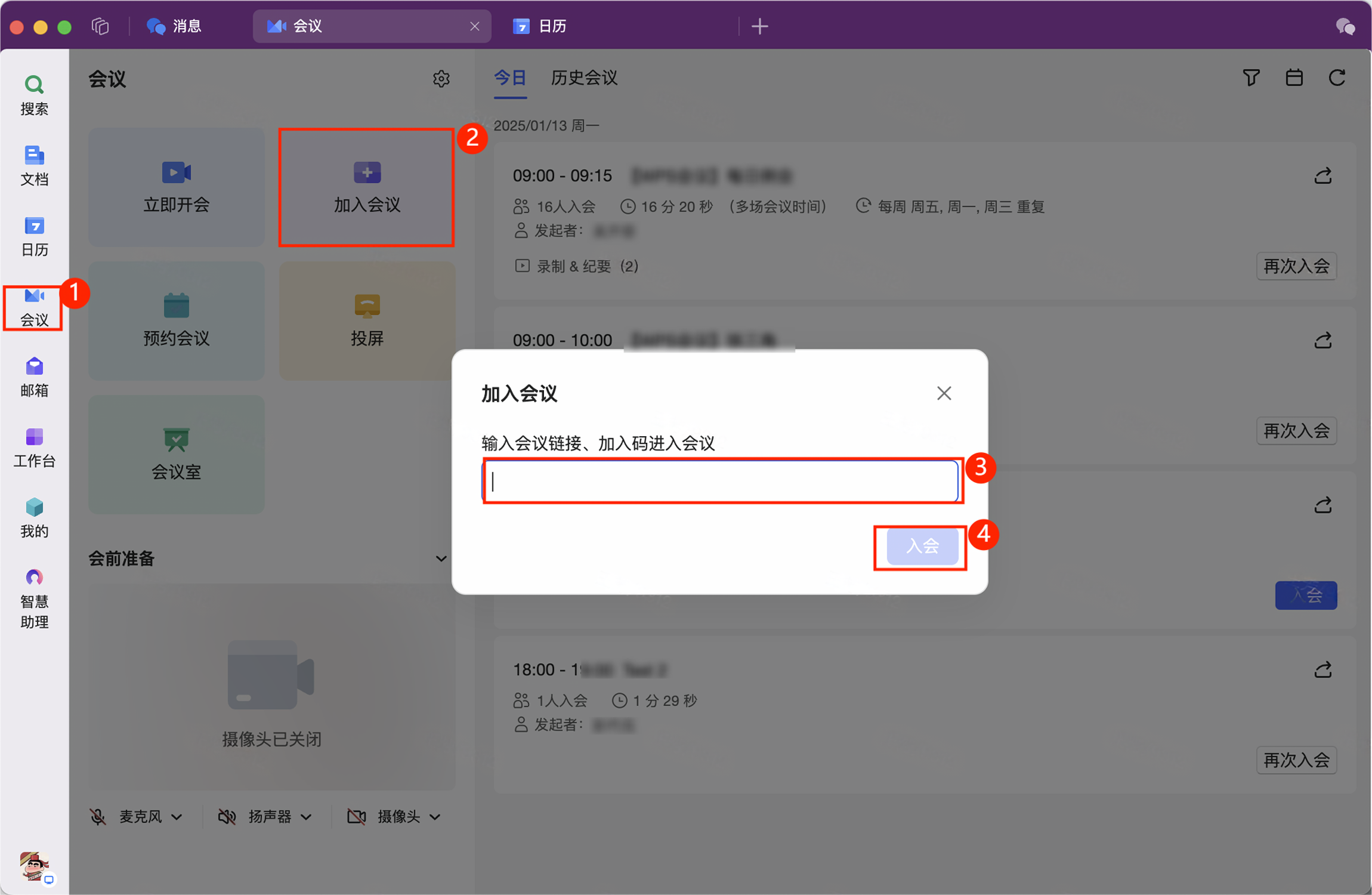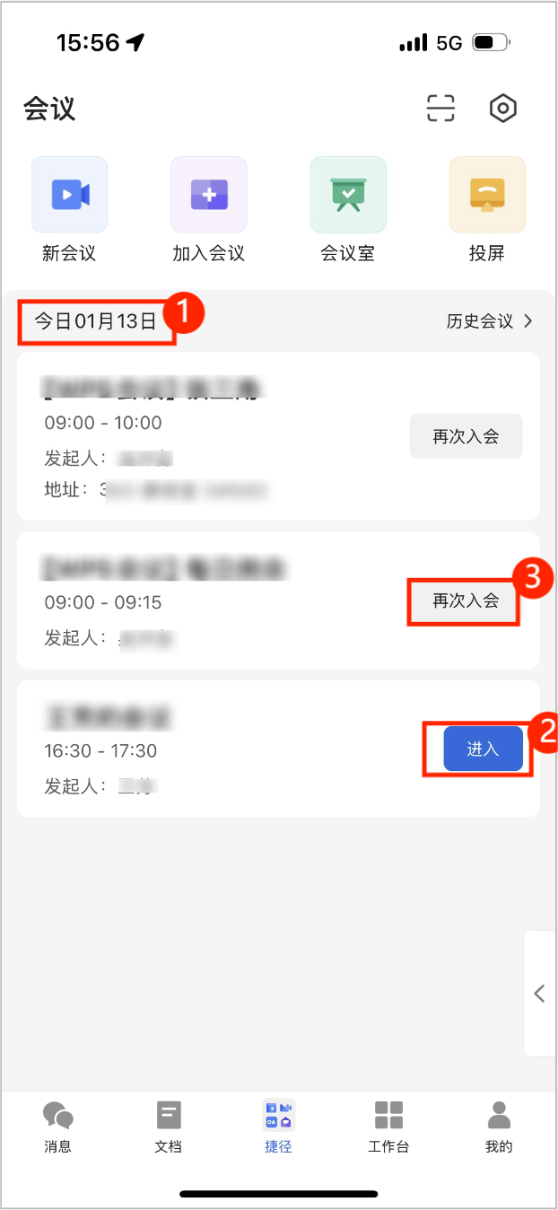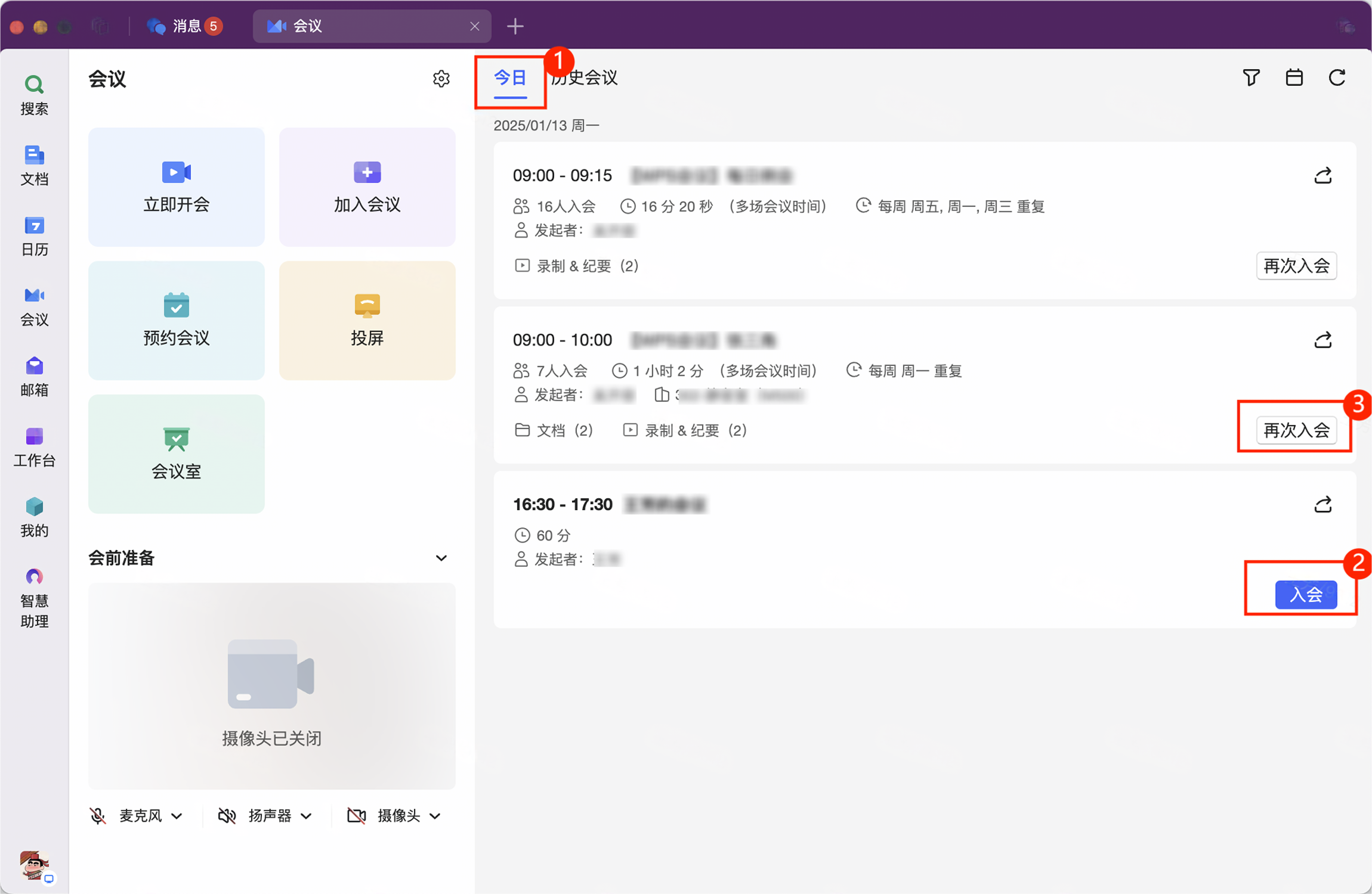 已加入日程的会议,可在会议首页>今日【会议日程】中直接点击【入会/再次入会】。
