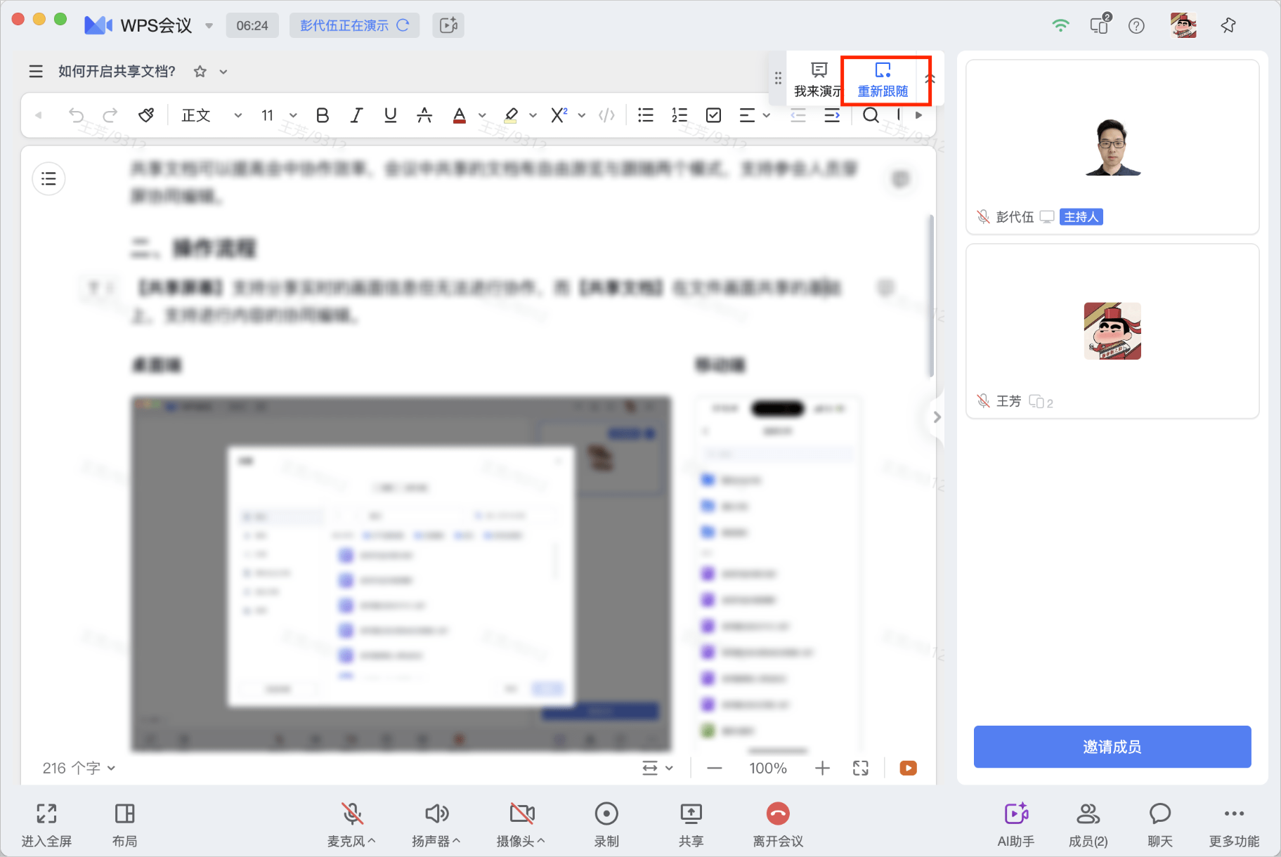 屏幕共享功能是会议中常用的功能,允许参会人员通过一键操作轻松共享桌面、分享课程或文件等资源。此外,共享文档可以显著提高会议期间的协作效率。在会议中,共享文档支持两种模式:自由游览与跟随模式,确保参会人员能够高效地进行穿屏协同编辑工作。