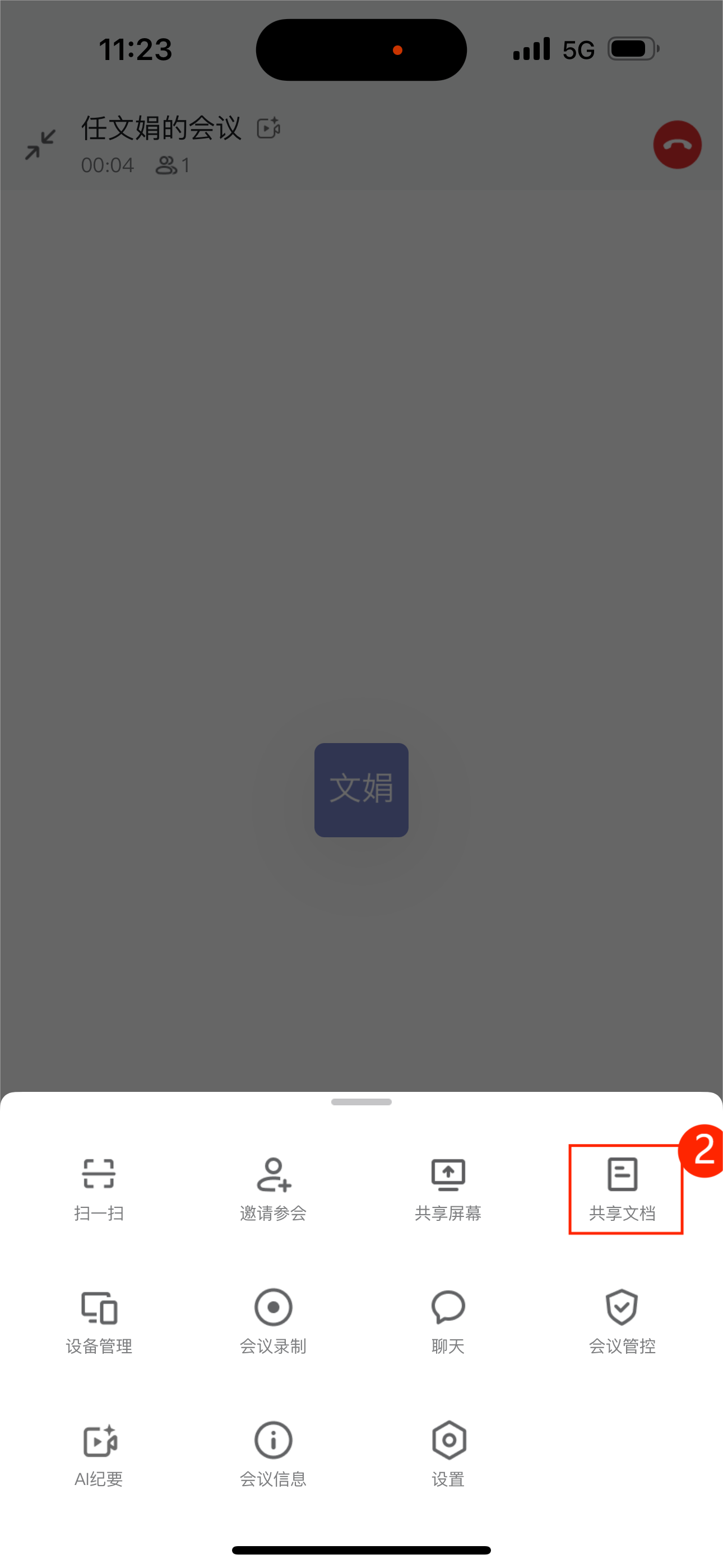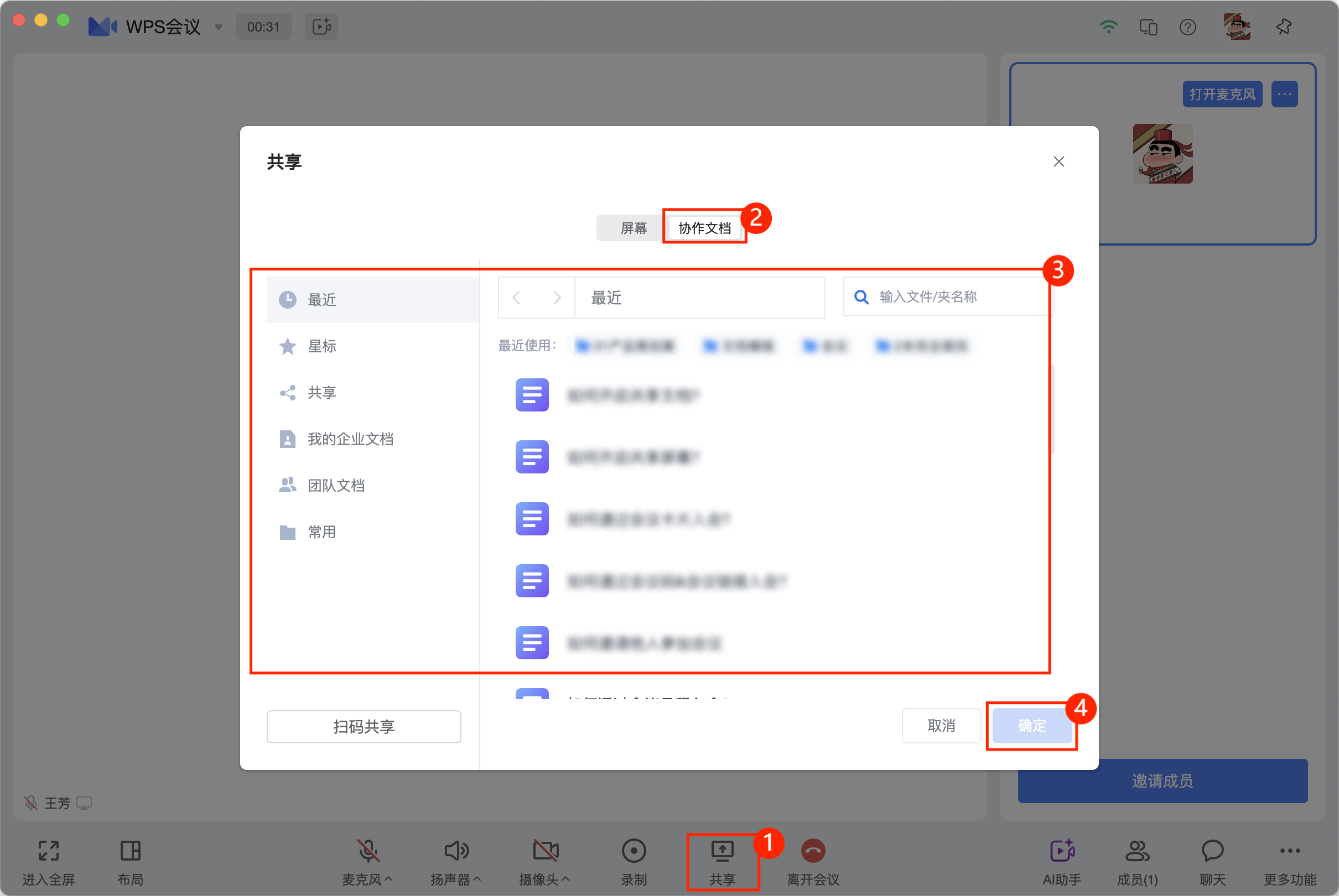 在会议菜单栏中,点击共享>协作文档,选择需要共享的文档即可。