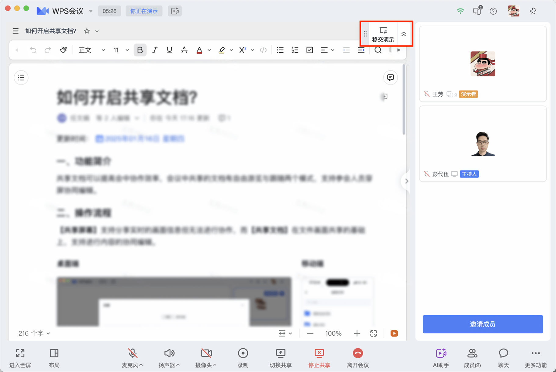 对于同一份文档有多个演示者需要进行演示控制时,桌面端支持【移交演示】进行灵活演示权交接。