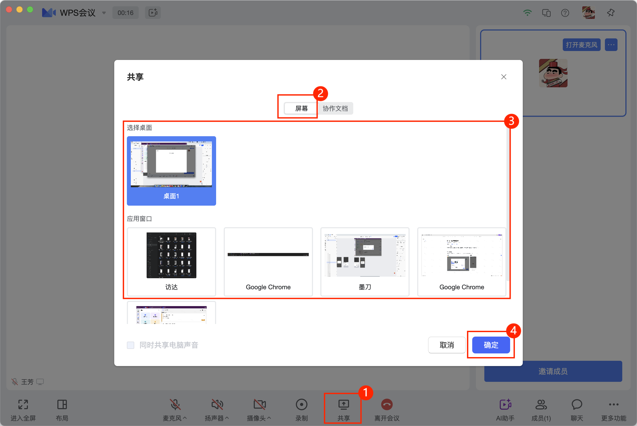 在会议菜单栏中,点击共享>共享屏幕,选择目标共享的桌面,或者目标应用窗口,即可进行内容的画面共享。