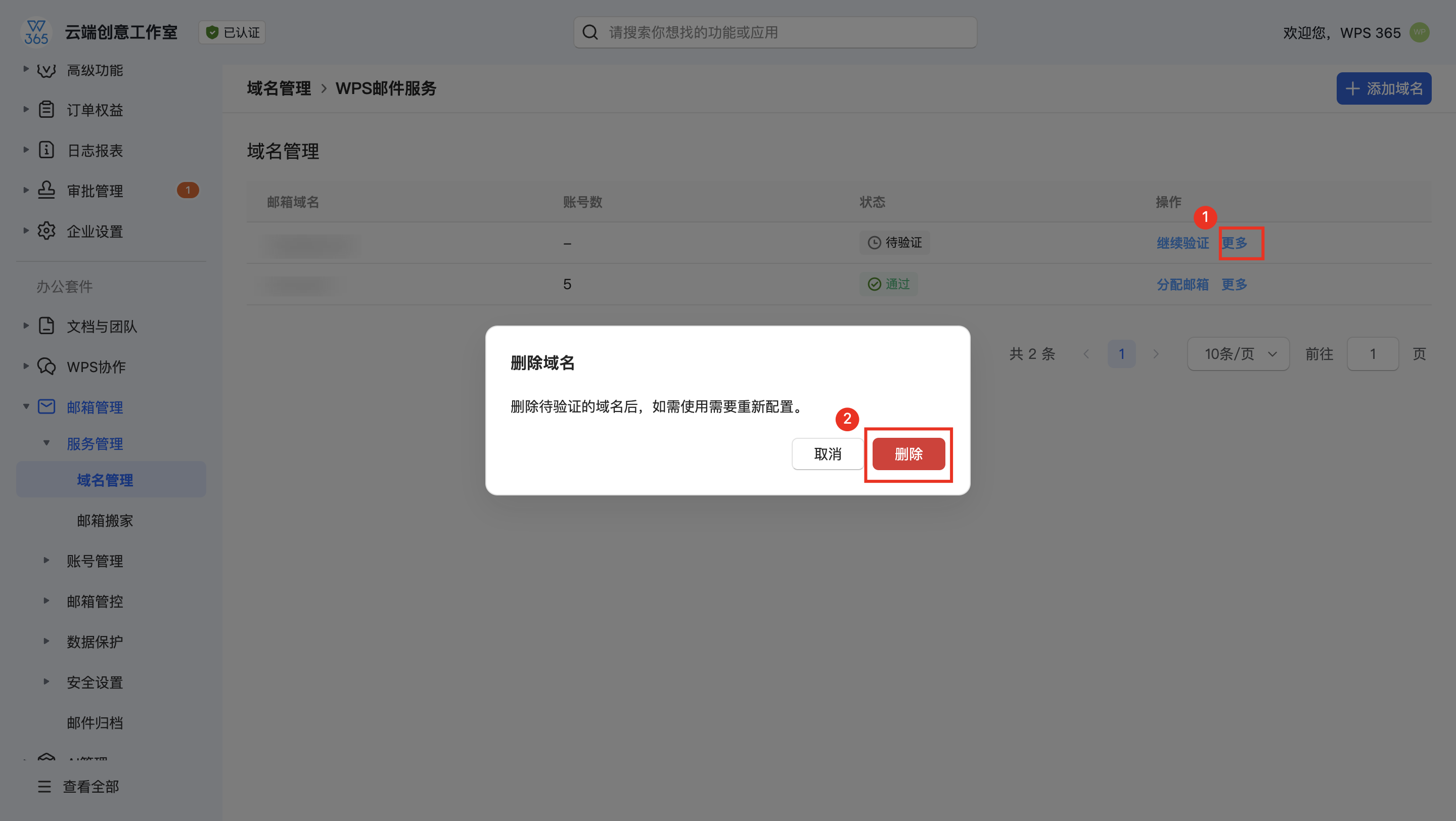 删除待验证状态的域名