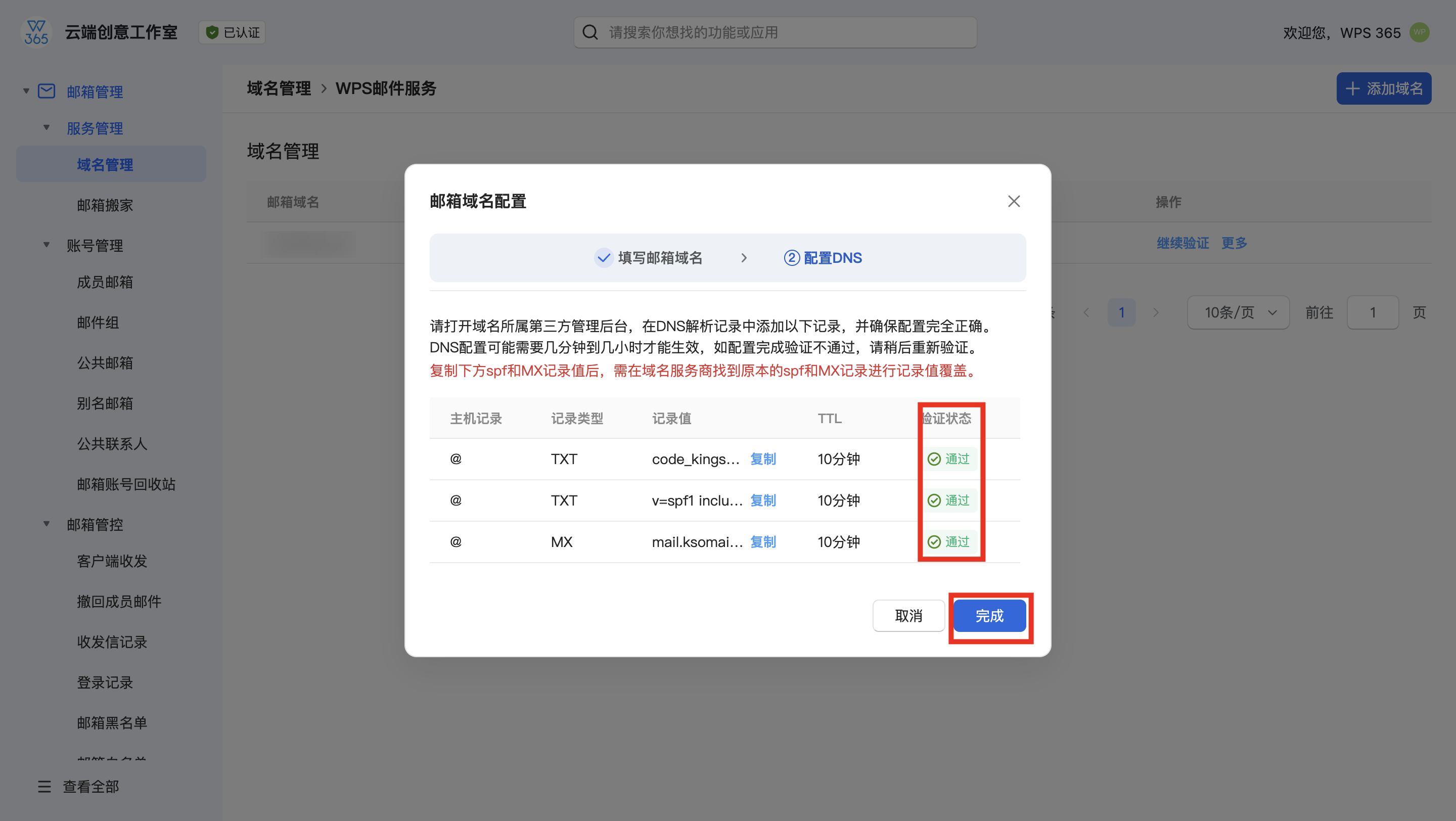 回到配置DNS页面,点击【验证】,验证通过后点击【完成】,即实现了该域名的添加。