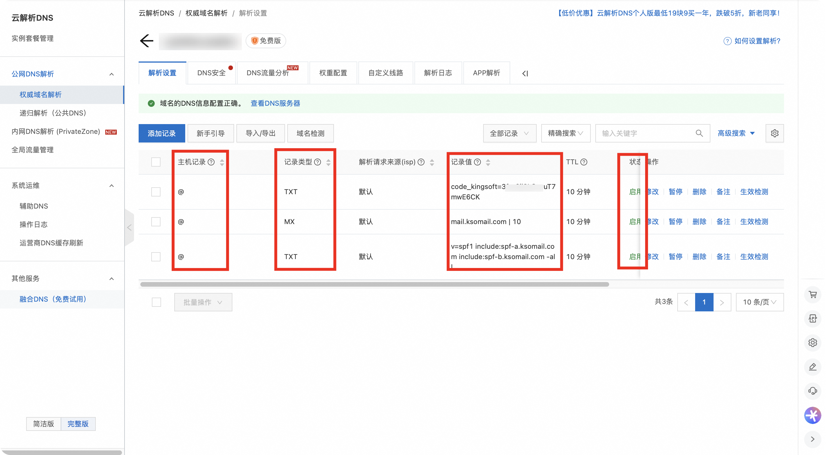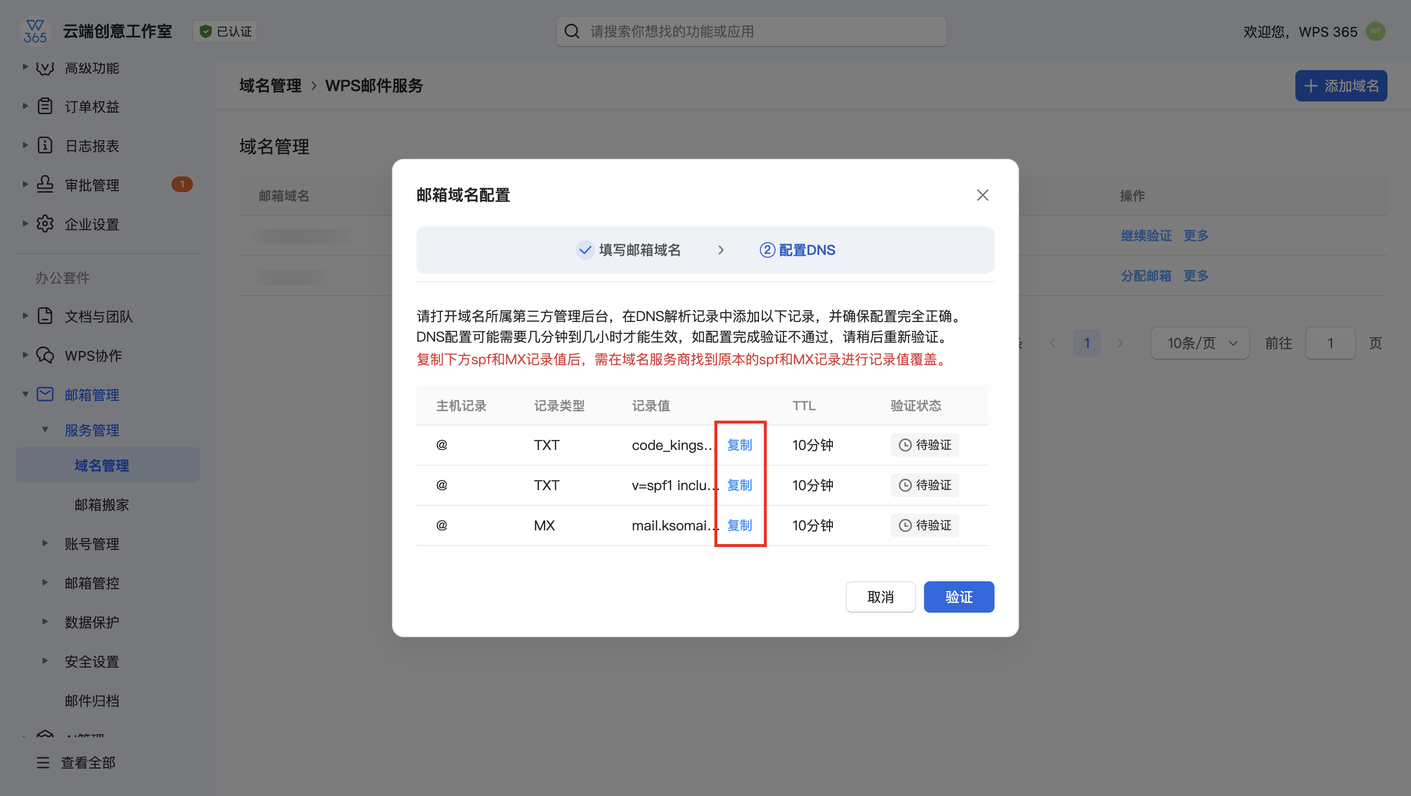 答:华为云要求单个类型的解析必须合并。请将两条TXT解析在华为云合并为一条,然后再回到WPS进行验证。