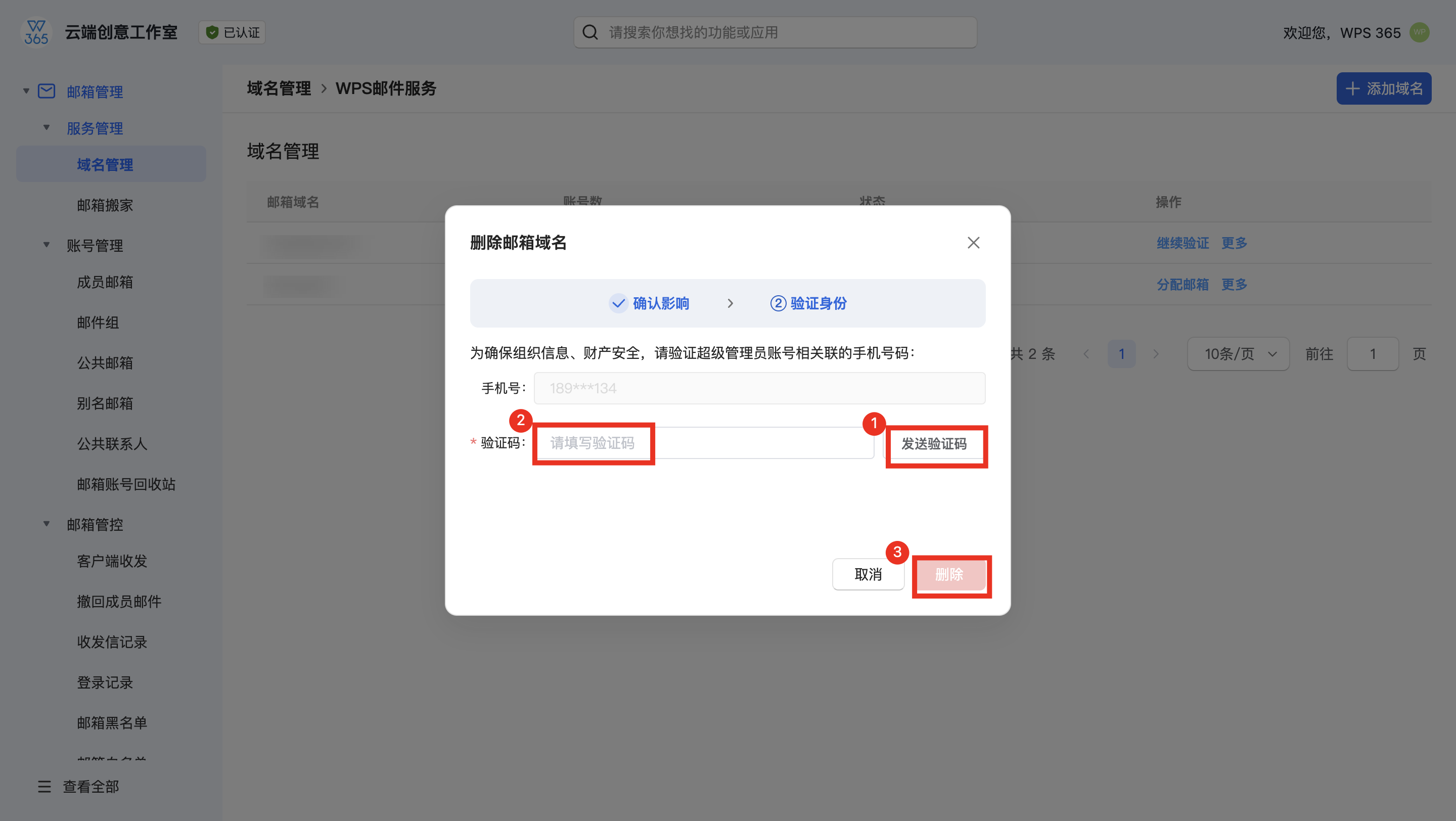 在删除邮箱域名-验证身份弹窗中,点击【发送验证码】,将收到的验证码输入,点击【删除】,完成该域名的删除。