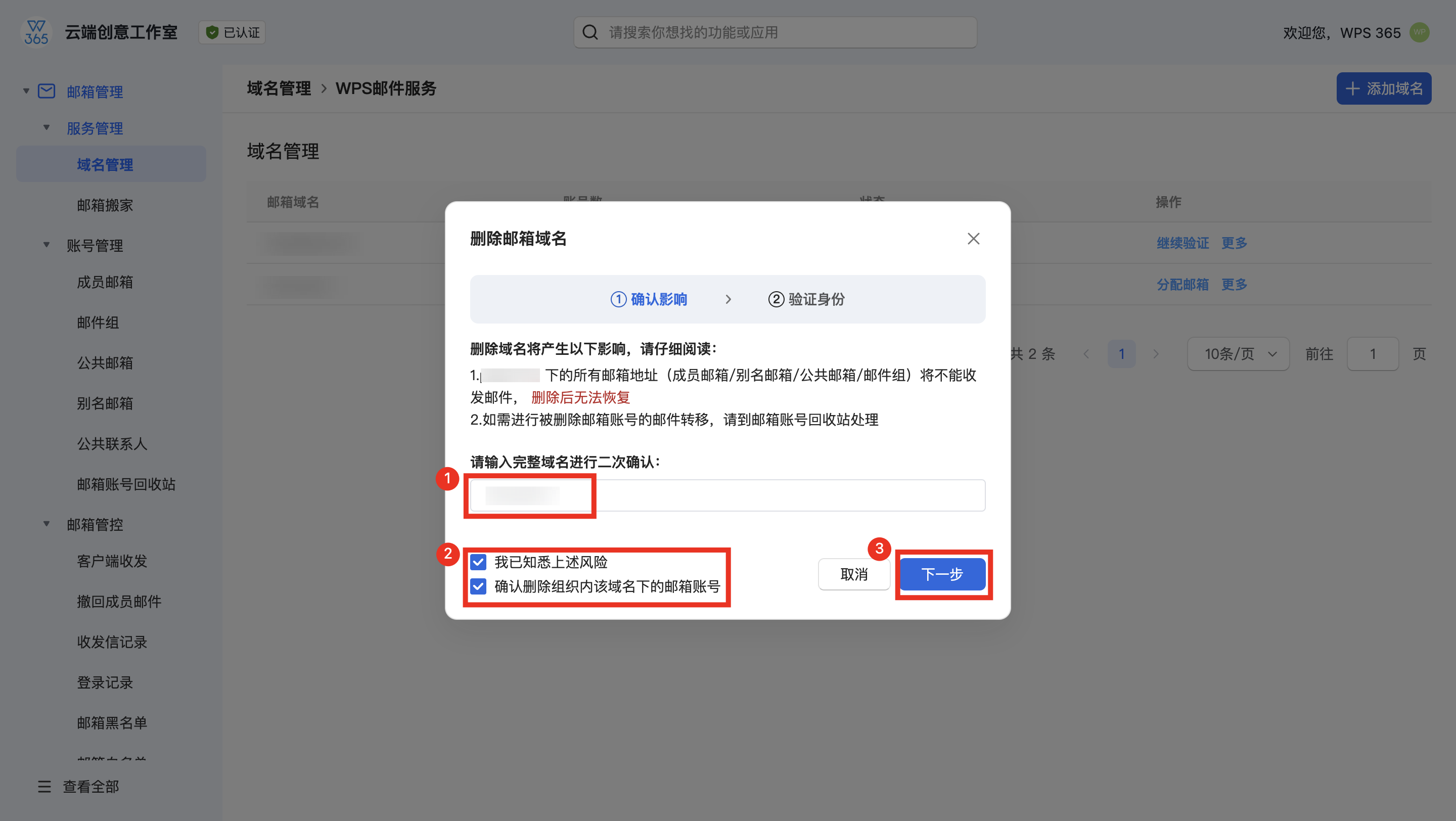 在删除邮箱域名-确认影响弹窗中,仔细阅读删除域名后产生的影响,输入完整域名进行二次确认,勾选已知风险及确认信息,点击【下一步】。