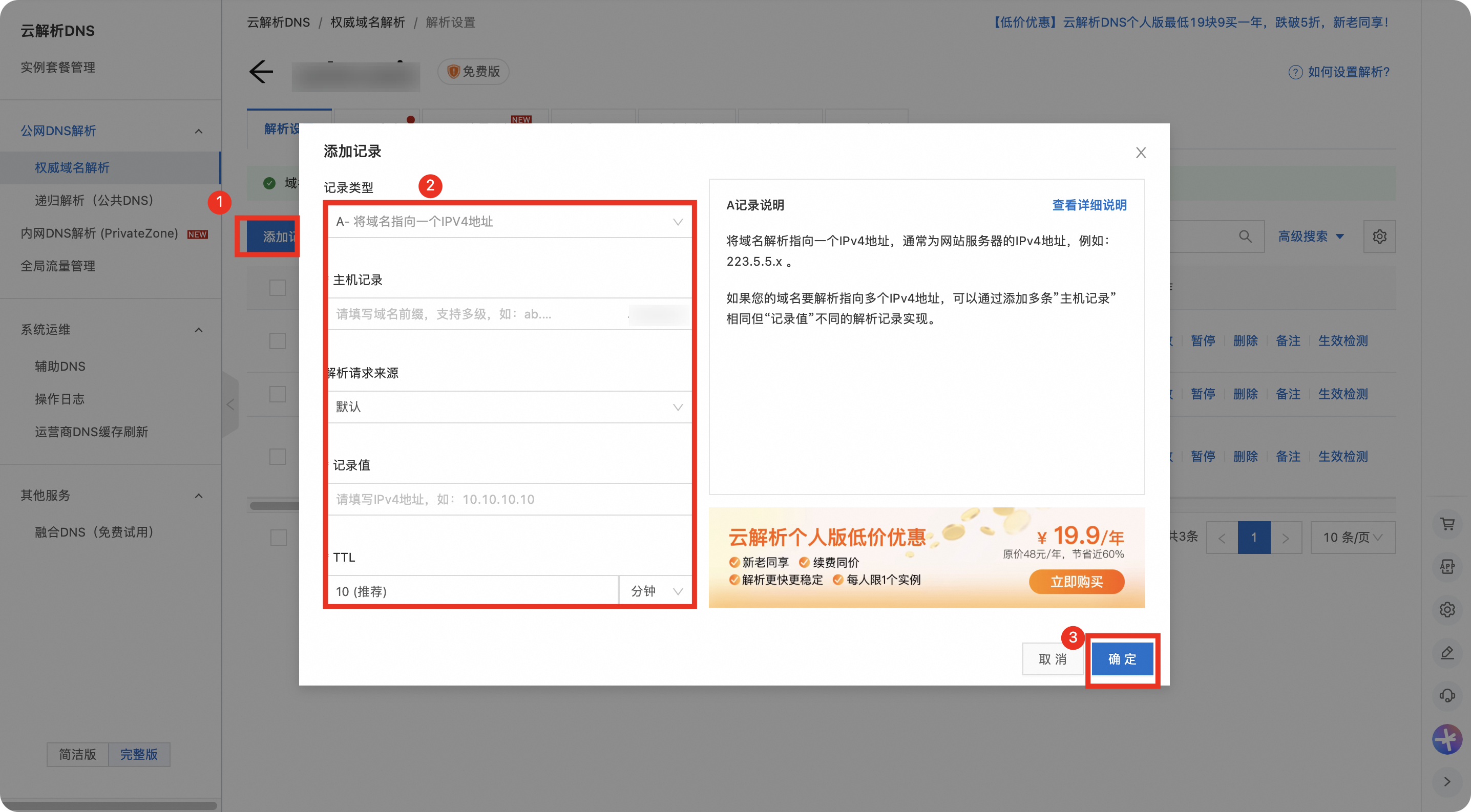 将生成的DNS解析分别复制>粘贴到域名所属的运营商后台(此处截图以阿里云为例,其他服务商类似)。