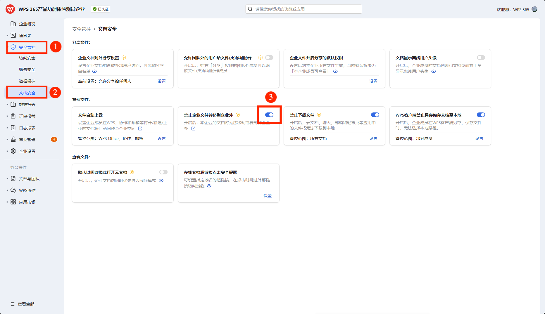 WPS365办公新质生产力平台-协同办公软件-数字资产管理-首页    帮助中心    WPS安全管控    管理员设置文档禁止转移企业外